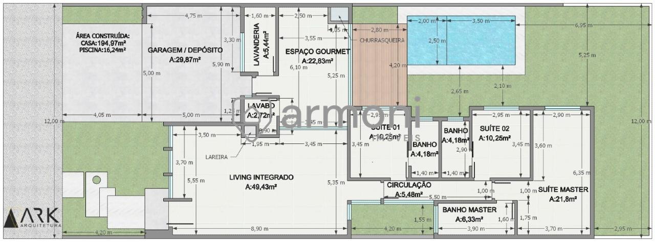 Possui esperas para ar-condicionado, energia solar, carro elétrico, automação e aquecimento da piscina.